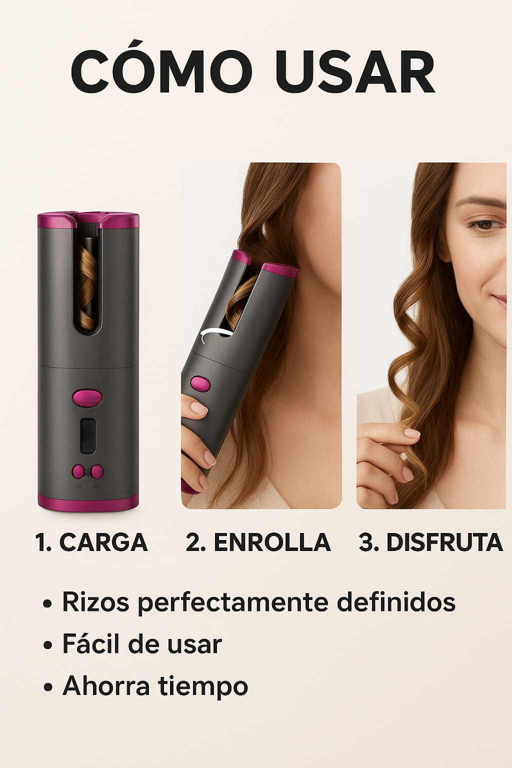 • Rizado automático inteligente: Solo tienes que colocar un mechón de cabello y presionar un botón. El rizador succiona el cabello, lo calienta y te entrega un rizo perfecto en segundos.